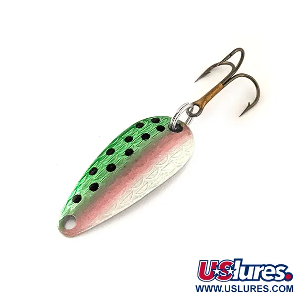 Met een gewicht van 1/8 oz (4,3 g) voegt het reliëf schubpatroon op deze klassieke lepel een unieke textuur toe aan de zilveren basis. De Trout-afwerking is zorgvuldig aangebracht, met een levendige groene bovenkant met zwarte stippen die overgaat in een delicate roze zijlijn in het midden. Op de gepolijste achterzijde is de stempeling 'THOMAS S514 1/8 oz CYCLONE' scherp en volledig leesbaar, wat de specifieke modellijn van Amerikaanse oorsprong identificeert. Met een lengte van 3 cm (1 1/4") verkeert de lepel in uitstekende staat, gewaardeerd op 5/5 voor de behouden afwerking en het originele beslag. Het beslag bestaat uit een enkele bronzen dreg bevestigd via een zilverkleurige splitring. Productcode 13130 identificeert dit specifieke exemplaar, dat het vakmanschap van Thomas Spinning Lures in metalen lepels benadrukt.