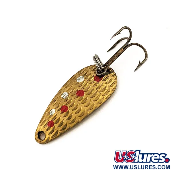 Gehamerde koperen schubben vangen het licht op het druppelvormige lichaam van dit vintage exemplaar. Een 5/5 score weerspiegelt de uitstekende staat, met een glanzend oppervlak zonder tekenen van slijtage. Op de bolle kant zijn drie rode en drie zilveren stippen nauwkeurig geplaatst over het gestructureerde schubbenpatroon om een duidelijk visueel profiel te creëren. Deze 1 1/4" (3 cm) lepel is uitgerust met een gebronsde dreg, verbonden door een stevige splitring aan de staart. De achterzijde is voorzien van de stempel van de fabrikant inclusief de naam "Cyclone" en de gewichtsaanduiding. Met een gewicht van 1/8 oz (4,3 g) is dit kunstaas, geïdentificeerd door productcode 13155, geproduceerd in de USA en voorzien van een nauwkeurig geboord oog aan het smalle uiteinde.