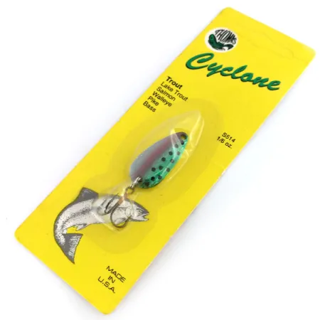 De Thomas Cyclone lepel in regenboogforel-patroon heeft een levendig verloop van groen naar roze met duidelijke zwarte stippen op het gebogen lichaam. Met een gewicht van 4,3 g (1/8 oz) en een lengte van 3 cm (1 1/4") is dit kunstaas voorzien van een diepe schubbenstructuur die het licht vanuit verschillende hoeken reflecteert. Geproduceerd in de VS door Thomas, is deze metalen lepel een klassieke keuze voor vissers die zich richten op forel, zalm en snoekbaars. De montage bestaat uit een scherpe dreg die met een stevige splitring aan de achterzijde is bevestigd. Dit exemplaar is gemarkeerd met productcode 9915 en is ongebruikt in de originele verpakking.