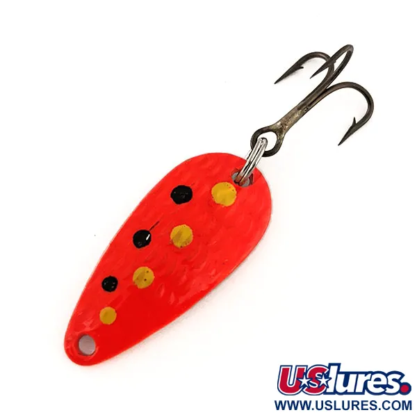 Een gehamerde textuur bedekt het lichaam van deze Thomas Cyclone UV, waardoor het metaal vanuit elke hoek licht vangt. Deze lepel met productcode 11492 is 1 1/4" (3 cm) lang en heeft een fluorescerende oranje basis met handmatig aangebrachte gele en zwarte puntaccenten. Onder UV-licht geeft de afwerking een duidelijke gloed af, een ontwerpkenmerk bedoeld voor omgevingen met weinig zicht of dieper water. Deze lepel van 1/8 oz (4,3 g) is vervaardigd in de USA en heeft nog het originele beslag, inclusief een splitring en een gebronsde dreg. Het exemplaar verkeert in 5/5 conditie, waarbij de afwerking en metalen onderdelen er schoon en goed bewaard uitzien.