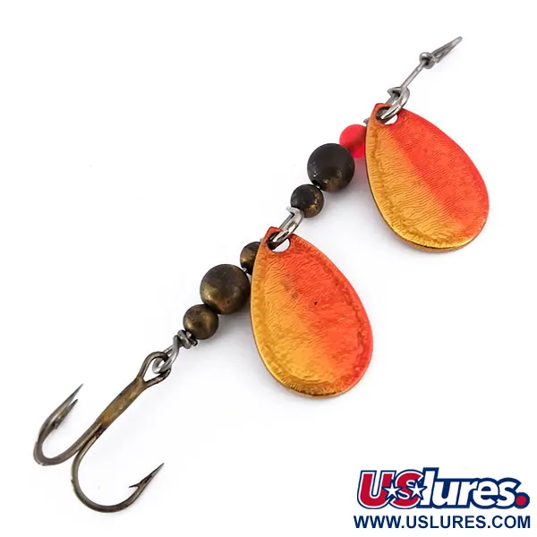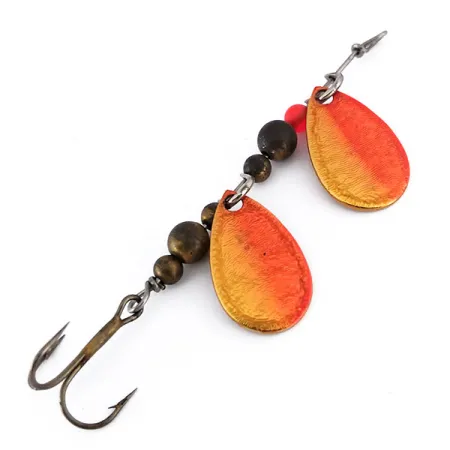Met een lengte van 7 cm (2 3/4") toont deze spinner met dubbel blad het klassieke Amerikaanse vakmanschap van Thomas hardware. Elk van de twee druppelvormige bladen is afgewerkt in een Goud / Rood verloop, waarbij een metallic gouden basis overgaat in een rijke oranjerode tint. Wanneer u de bladen omdraait, ziet u de authentieke fabrieksstempels die de spinner identificeren als een THOMAS DOUBLE SPINN, met diep in het metaal geslagen gewichtsmarkeringen. De interne montage bestaat uit donkere koperen kralen van verschillende groottes, aangevuld met een enkele levendige rode kraal aan de bovenkant van het metalen frame. Een donker afgewerkte dreg is aan de achterzijde bevestigd, passend bij de functionele esthetiek van dit vintage, in de VS gemaakte kunstaas. Met een waardering van 5/5 vertoont dit exemplaar van 5 g (3/16 oz), gecatalogiseerd onder productcode 10133, uitzonderlijk schone oppervlakken op zowel de geverfde als de gestempelde onderdelen.