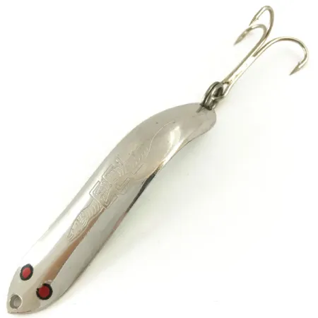 Een gepolijste nikkelen afwerking kenmerkt het 6 cm lange lichaam van deze vintage lepel, die twee duidelijke rode stippen heeft bij het oogje. In de voorzijde is de naamplaat „EEL” gestanst, vergezeld van een gedetailleerd vismotief, kenmerkend voor de productie van Thomas Lures uit de VS. Ondanks de aanduiding met productcode 5657 en een gewicht van 10 g, vertoont de achterzijde van het metaal een fabrieksstempel „3/8 OZ”, samen met het modelnummer R324 en het merklogo. De montage bestaat uit een robuuste dreg bevestigd via een splitring, zonder tekenen van gebruik. Dit exemplaar verkeert in uitstekende staat (5/5) en behoudt een spiegelachtige glans op het gebogen oppervlak. Het kunstaas is uitgebalanceerd voor verschillende werp- en sleeptoepassingen waarbij een slank profiel vereist is.