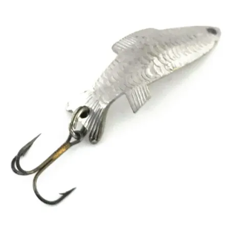 Gestempelde schubben en realistische vincontouren sieren het oppervlak van deze vernikkelde lepel. Met een gewicht van 1/4oz (7g) is de Thomas Fighting Fish een compacte 1 1/2" (4cm) lang. Ontworpen door Thomas Spinning Lures uit de VS, heeft dit specifieke model (productcode 9214) een opvallend visvormig profiel dat hem onderscheidt van standaard ovale lepels. Aan de achterzijde van het kunstaas is de tekst "FIGHTING FISH" duidelijk in de gladde nikkelen afwerking geperst, samen met een klein logo bij de rugvin. Een enkele dreg is stevig aan de staart bevestigd via een robuuste splitring. De conditie van de lepel is 5/5, met een glanzend, reflecterend oppervlak en schoon metaalwerk over het gehele oppervlak.