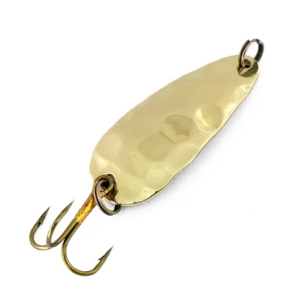 Handgestempelde letters op de achterzijde van deze messing lepel luiden 'RICHARDS 1/5 OZ CANDU IT', een persoonlijk eerbetoon aan de oprichter Richard Shubert die het merk Thomas midden jaren veertig oprichtte na zijn aankomst in de VS vanuit Tsjechoslowakije. Gecatalogiseerd onder productcode 10715, heeft het kunstaas een gewicht van 5 g (3/16 oz) en een totale lengte van 4 cm (1 1/2"). Een duidelijke gehamerde textuur bedekt de bolle zijde, wat zorgt voor een traditionele esthetiek voor werpend vissen of trollen. De montage bestaat uit een gebronste dreg en twee stevige splitringen, die allemaal uitzonderlijk schoon zijn gebleven, wat bijdraagt aan een 5/5 conditiescore voor dit vintage exemplaar. Deze gepolijste messing oppervlakken behouden de originele glans en de scherpe helderheid van de gravures, een eerbetoon aan een maker die naar Amerika kwam om zijn droom van het produceren van hoogwaardige vismaterialen te verwezenlijken.