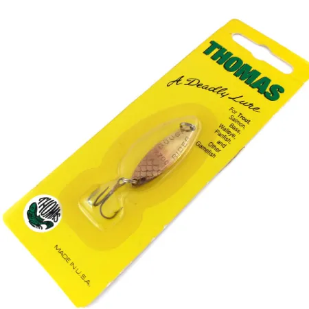Een koperen laag bedekt het lichaam met schubbenpatroon van deze klassieke lepel, wat zorgt voor een hoogglanzend oppervlak dat is ontworpen om de aandacht van forel en zalm te trekken. Met een gewicht van 1/4oz (7g) heeft de Thomas Rough Rider een kenmerkende getextureerde afwerking die de natuurlijke schubben van aasvissen nabootst. Dit exemplaar, herkenbaar aan productcode 9997, is 3,7 cm (1 1/2") lang en zit nog in de originele fabrieksverpakking met gele achterkant. Het stempel op de metalen zijde toont duidelijk de modelnaam "ROUGH RIDER", wat de kwaliteit van de Amerikaanse productie weerspiegelt. Dit kunstaas is ongebruikt en verkeert in originele winkelstaat, met een conditiescore van 6. Er is een stevig bevestigde dreg met bronzen afwerking gemonteerd, geschikt voor het werpen in beken of slepend vissen op bergmeren. De vintage verpakking vermeldt de effectiviteit voor breedbekbaars en witvis, wat de veelzijdigheid aantoont waardoor Thomas-lepels al decennia in de tacklebox van vissers te vinden zijn.
