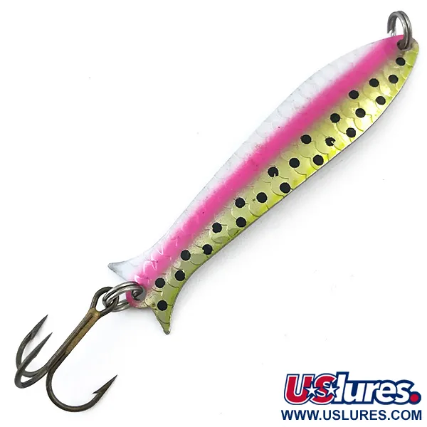 Deze 6,5 cm (2 1/2") lepel is op de achterzijde gestempeld met het klassieke logo en de gewichtsvermelding en toont de duurzame vernikkeling die synoniem staat voor de Amerikaanse productie van Thomas. De Trout / Nickel afwerking is bijzonder opvallend, met een krachtige neonroze zijlijn gecombineerd met goudgroene schubaccenten en een reeks diepzwarte stippen. Met een gewicht van 5 g (3/16 oz) is dit kunstaas speciaal gebouwd voor het trollen, waarbij gebruik wordt gemaakt van een slank, langwerpig profiel om de zichtbaarheid in verschillende lichtomstandigheden te maximaliseren. Dit specifieke exemplaar, met productcode 5040, verkeert in 5/5 staat, waarbij de lak en hardware uitzonderlijk goed bewaard zijn gebleven. Het is uitgerust met twee sterke splitringen en een scherpe dreg aan de staart, wat de kwaliteitsconstructie benadrukt die verwacht mag worden van een vintage in de VS gemaakt kunstaas.