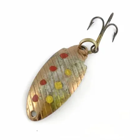 Een diagonaal ribbelpatroon kenmerkt de voorzijde van deze koperkleurige lepel, wat een gestructureerd oppervlak biedt voor de handmatig aangebrachte rode en gele stippen. Met een lengte van 4 cm (1 1/2") en een gewicht van 5 g (3/16 oz), is deze Tommen Dolly vervaardigd in de VS en voorzien van productcode 23684. Het kunstaas is uitgerust met een dreg die via een splitring is bevestigd, terwijl een enkel bevestigingsoog zich aan de taps toelopende voorzijde bevindt. In een conditie van 4/5 vertonen het metaal en de lak een zachte, verouderde uitstraling die de vintage status bevestigt. Een eenvoudige splitring verbindt het beslag aan de achterzijde met het gestanste metalen lichaam.
