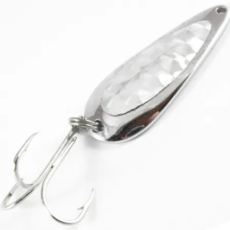 De vernikkelde laag glanst helder op deze Tony Accetta 3 H en vangt het licht op het kenmerkende prisma-oppervlak met textuur. Met een gewicht van 11g (2/5oz) heeft deze in de VS gemaakte lepel een klassiek druppelprofiel met een lengte van 4,5cm (1 3/4"). Verzamelaars zullen de 5/5 conditie waarderen, die de behouden integriteit van het metaalwerk en de hardware benadrukt. De constructie bevat een stevige splitring bevestigd aan een scherpe dreg, specifiek ontworpen voor werptechnieken. Dit specifieke exemplaar, geïdentificeerd door productcode 3728, toont het klassieke vakmanschap dat Accetta tot een hoofdbestanddeel maakte in viskoffers uit het midden van de eeuw. Het gefacetteerde binnenpaneel is ontworpen om de schittering vanuit verschillende hoeken te maximaliseren tijdens een gestage inhaalbeweging.