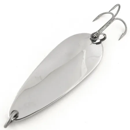 De vernikkelde afwerking geeft deze lepel van 21g (3/4oz) een opvallende schittering die al decennia lang een vaste waarde is in tackleboxen. Op de voorzijde is duidelijk het merk 'TONY ACCETTA 7' gestempeld, wat de herkomst als een klassieke, in de VS gemaakte kunstaas bevestigt. Met een lengte van 6,5 cm (2 1/2") is het metalen lichaam zwaar genoeg voor verre worpen of trollen. Dit item, vermeld onder productcode 13146, verkeert in 4/5 conditie en vertoont een goed onderhouden oppervlak met slechts enkele lichte gebruikssporen. Het beslag is compleet, met originele splitringen en een robuuste dreg.