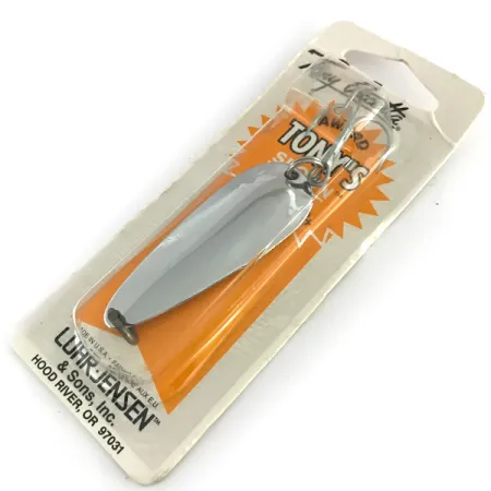 Een vernikkelde afwerking met een lengte van 5,5 cm (2 1/4") kenmerkt het reflecterende oppervlak van deze Tony Accetta Tony’s Spoon. Geïdentificeerd door productcode 8454, is deze 11g (2/5 oz) lepel een uitstekend voorbeeld uit het Luhr Jensen & Sons tijdperk in Hood River, Oregon. Hij is ongebruikt en bewaard in de originele vintage blisterverpakking, met de klassieke oranje graphics en historische bedrijfsgegevens op de achterzijde. Ontworpen voor direct gebruik bij het werpen of trollen, is de lepel voorzien van een eenvoudig vooroog en een enkele haak bevestigd met een betrouwbare splitring. Het gestanste metaal behoudt zijn glanzende afwerking zonder enige tekenen van slijtage door de opslag.