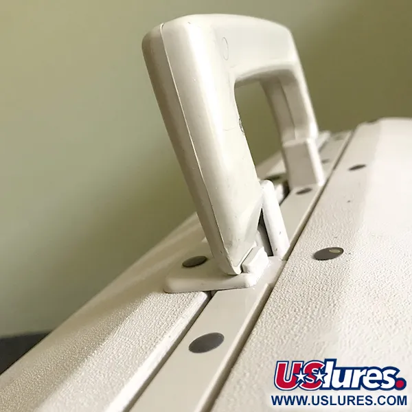 Met een lengte van 50 cm (19 3/4") belichaamt deze klassieke tweekleurige organizer de robuuste bruikbaarheid waar Plano Molding Co. om bekend stond tijdens hun productieperiode in Illinois. De witte bovenkant en contrasterende grijze onderkant herbergen een complex interieur met 6 uitklapbare plateaus die 45 afzonderlijke vakken onthullen voor kunstaas en kleinmateriaal. Op de sluiting toont het originele stempel duidelijk het modelnummer 8600 naast het "P"-logo en een iconische afbeelding van een springende vis. Dit in de VS gemaakte exemplaar, met productcode 6574, behoudt zijn structurele integriteit met volledig functionele scharnieren en sloten. De koffer is circa 28 cm (11") hoog en 25 cm (9 7/8") breed in gesloten toestand en vertoont wat lichte krassen door eerder gebruik, maar is vrij van barsten. Het stevige witte handvat en de metalen beugelsluiting werken soepel, wat de goed onderhouden conditie van 4/5 weerspiegelt. De achterscharnieren zijn stevig bevestigd, zodat de deksel goed uitgelijnd blijft bij toegang tot het diepe onderste opbergvak.