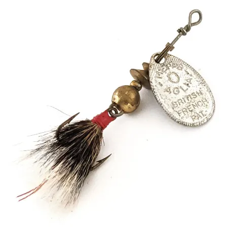 Gestempeld met "BRITISH FRENCH PAT" en "MADE IN FRANCE", weerspiegelt het zilveren blad van dit exemplaar uit de jaren 70 het erfgoed van het klassieke Andre Meulnart-ontwerp. Met een gewicht van 2,5 g (3/32 oz) heeft deze spinner in maat 0 de iconische Mepps Aglia vorm. De dressing op de dreg is van echt eekhoornstaarthaar, zorgvuldig gebonden met een levendige rode draad die zijn kleur decennialang opmerkelijk goed heeft behouden. Met een totale lengte van 4,5 cm (1 3/4") toont het kunstaas de messing kralen en de beugel die de Mepps-standaard voor duurzaamheid bepaalden. Dit specifieke item, herkenbaar aan productcode 13124, werd geassembleerd in de VS met in Frankrijk gemaakte componenten, een gebruikelijk gebruik tijdens de uitbreiding van het merk onder Todd Sheldon halverwege de eeuw. Het beslag betreft een dreg die nog steeds scherp is en de verzilvering op het blad behoudt een heldere, reflecterende afwerking. De staat is een uitstekende 5/5, wat getuigt van de zorg die is besteed aan het behoud van dit verfijnde lichte materiaal. Het brede bladontwerp is zo ontworpen dat het gaat draaien zodra het in contact komt met water, een technisch kenmerk van het kegelrotatiesysteem. De natuurlijke textuur van het eekhoornstaarthaar zorgt voor een subtiel profielcontrast tegen de metalen onderdelen.