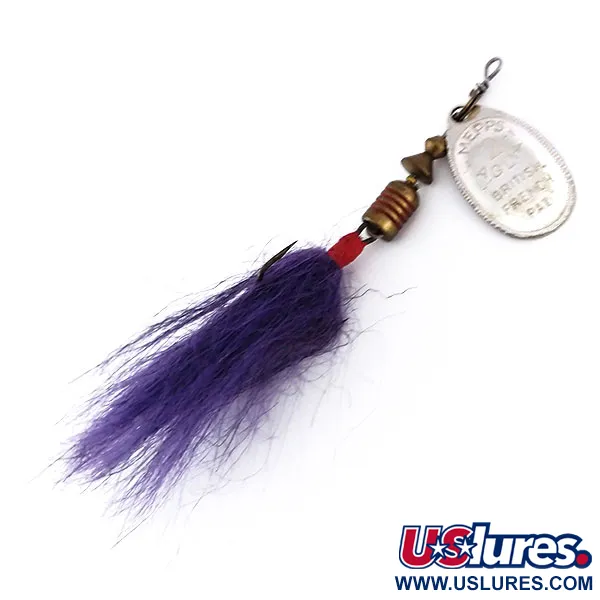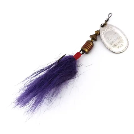 De paarse bucktail-versiering kenmerkt dit exemplaar uit de jaren 70 en biedt een scherp visueel contrast met het zilverkleurige blad. Met een gewicht van 4,7 g (3/16 oz) heeft dit kunstaas de klassieke Mepps Aglia configuratie met een blad maat 2, voorzien van de inscriptie "BRITISH FRENCH PAT." op de voorzijde en "MADE IN FRANCE" op de achterzijde. Deze onderdelen vertegenwoordigen het tijdperk waarin de componenten in Frankrijk werden vervaardigd en in de VS werden geassembleerd onder leiding van Todd Sheldon. De totale lengte bedraagt 5,5 cm (2 1/4") en de opbouw omvat een as van massief metaaldraad, twee koperen kralen en een felrode afstandskraal direct boven de versierde dreg. De verzilvering van het blad is nog steeds glanzend, wat bijdraagt aan een conditiescore van 5/5. De haarbundel is stevig vastgezet en heeft nog de oorspronkelijke volheid. Een gespecialiseerd ruitertje zorgt ervoor dat het blad om het koperen lichaam draait, een fundamenteel ontwerpelement van de uitvinding van André Meulnart uit 1938. Dit specifieke item, met productcode 10130, is een goed bewaard gebleven voorbeeld van 's werelds meest bekende spinnerprofiel.