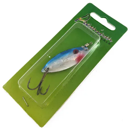 Blauwe en zilveren afwerkingen geven deze 4,5 cm druppelvormige lepel een klassiek aasvisprofiel. Met een gewicht van 7 gram is de Wahoo Key Largo Swim'n Fin ontworpen met een interne ratelkamer voor een geluidsprikkel naast de visuele schittering tijdens het verticalen of werpen. Dit exemplaar heeft fabrikantcode 17395 en bevindt zich nog in de originele groene "Premium" merkverpakking. Het kleurenpatroon verloopt van een felblauwe rug naar een glinsterende zilveren buik, geaccentueerd door een opvallend rood strike point bij het voorste oog. Uitgerust met een scherpe bronskleurige dreg en een robuuste wartel aan de neus, weerspiegelt dit kunstaas zijn oorsprong in de Dominicaanse Republiek, waar het is geassembleerd met Amerikaanse onderdelen. Dit exemplaar is ongebruikt en goed bewaard gebleven, met de originele fabrieksglans op de duurzame afwerking.