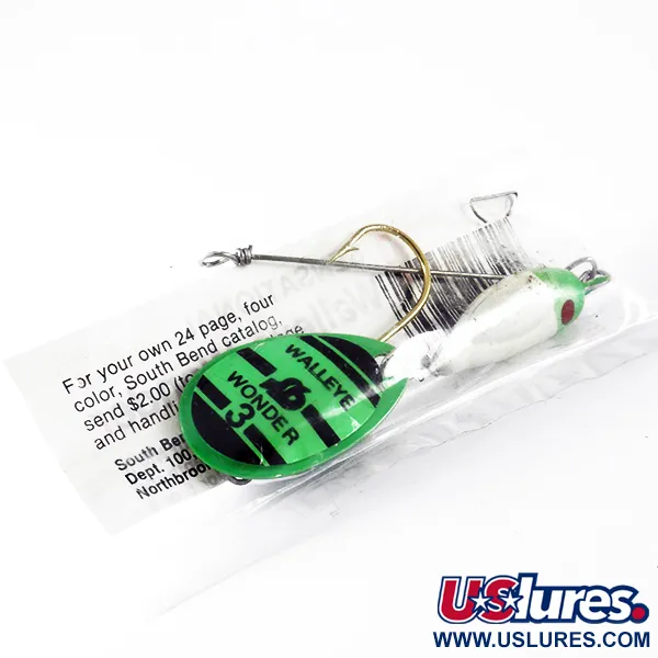 Levendige groene en zwarte strepen sieren het druppelvormige blad van deze South Bend Walleye Wonder 3, duidelijk voorzien van de modelnaam en het "SB" logo. Met een gewicht van 17 g (3/5 oz) heeft dit exemplaar een wit lichaam met een groen geverfde kop en een opvallend rood oog. Het kunstaas, geïdentificeerd met productcode 3697, is ongebruikt in de originele transparante plastic verpakking, inclusief een papieren bijsluiter met instructies voor werpen, trollen en driften. South Bend heeft deze rig ontworpen om te worden gecombineerd met een dauwworm of kunstmatige worm op de grote, goudkleurige haak. Achter het geverfde lichaam bevinden zich een reeks groene en metalen kralen op de metalen as voor de juiste afstand en visueel contrast. De verpakking bevat zelfs nog de vintage aanbieding voor een catalogus van 24 pagina's uit het tijdperk dat het bedrijf in Northbrook, Illinois was gevestigd.