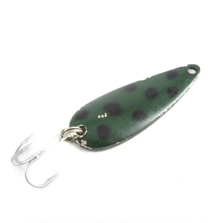 Groen gespikkelde verf bedekt de bolle kant van deze 6 cm druppelvormige lepel, wat hem een klassieke uitstraling geeft die doet denken aan vroege Amerikaanse veldgeteste uitrusting. Op de zilverkleurige onderkant is de merknaam Weber duidelijk gestempeld, wat de herkomst uit het Amerikaanse productietijdperk bevestigt. Met een gewicht van 12 g vertoont de massief metalen body duidelijke tekenen van tijd doorgebracht in een tacklebox, wat resulteert in een conditiescore van 3/5. Er is eerlijke slijtage te zien met klein verfverlies langs de randen en wat oxidatie op het metalen oppervlak, wat bijdraagt aan het vintage karakter. Dit specifieke exemplaar, geïdentificeerd door productcode 2861, is voorzien van een enkele dreg die via een splitring aan de basis is bevestigd. Het eenvoudige, functionele ontwerp is kenmerkend voor de focus van Weber op bruikbaarheid voor zowel werpen als trollen. Een schoon lijnoog is in het smalle uiteinde geponst, waardoor het een vast onderdeel blijft voor verzamelaars van traditioneel metaalwerk.