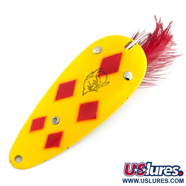 Vijf rode ruiten steken scherp af tegen het felgele emaille van deze 21 g (3/4 oz) lepel, een afwerking die onder verzamelaars beroemd is als het «Five of Diamonds»-patroon. Deze in de VS door Eppinger vervaardigde Weedless Dardevle Dardevlet (Productcode 9317) is 7 cm (2 3/4") lang en is voorzien van het kenmerkende duivelskoplogo van het merk, centraal op de bolle zijde. Op de achterkant is het koperen oppervlak duidelijk gestempeld met de naam Dardevle en het land van herkomst. Dit specifieke model is uitgevoerd met een enkele haak die wordt beschermd door dubbele metalen wierbeschermers en is verder verfraaid met een felrode verentrailer. Het exemplaar verkeert in 5/5 conditie, met prachtig bewaard gebleven schilderwerk en een schone, metalen achterzijde. Ontworpen voor het werpen in dichte vegetatie; de wierloze hardware is recht en functioneel, klaar voor zware begroeiing.