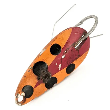 Met een gewicht van 6 g (3/16 oz) valt deze vintage lepel op door een opvallend rood, zwart en bruin patroon op een klassieke nikkelen basis. De Weedless Dardevle Midget (Productcode 12857) heeft een lengte van 3,5 cm (1 1/2") en is gebouwd met de kenmerkende concave vorm die Eppinger al sinds 1906 produceert. De voorkant is voorzien van opvallende zwarte stippen op het tweekleurige ontwerp, terwijl de achterkant de gestempelde naam van de fabrikant op het gepolijste nikkelen oppervlak laat zien. Een enkele haak met een metalen wierbeschermer kenmerkt dit als een gespecialiseerd hulpmiddel voor het vissen door dichte vegetatie. De afwerking verkeert in 4/5 conditie, met goed onderhouden oppervlakken die de Amerikaanse herkomst uit Michigan weerspiegelen. De zware draadbeschermer is ontworpen om vastlopers te voorkomen, een technisch kenmerk dat past bij de lange geschiedenis van het merk in het maken van duurzaam materiaal voor zware omstandigheden.
