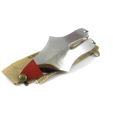 De Weedless Flirty Gertie is 3 1/4" (8,3 cm) lang en heeft een opvallend vernikkeld lichaam met een felrode neus. Met een gewicht van 3/4 oz (21 g) is deze zware metalen lepel ontworpen in Rockford, Illinois, speciaal voor het vissen in dichte begroeiing. De enkele grote haak is geïntegreerd in een wierloos systeem, geplaatst tussen de uitlopende vleugels van het gepolijste lichaam. Een paar kleine metalen druppelbladen zijn via splitringen aan de achterzijde bevestigd voor subtiele visuele prikkels tijdens het binnenvissen. Dit exemplaar, met productcode 2961, is in ongebruikte staat (waardering 6). Het zit nog op de originele verpakking met het adres van de fabrikant op 1916-20th Ave. De onderkant heeft een strakke, gebroken witte laklaag die contrasteert met de reflecterende nikkelen bovenkant.