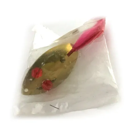 Met een lengte van 4,5 cm (1 3/4") heeft de Weedless Herter's model 9232 een gepolijst verguld lichaam geaccentueerd door twee doorschijnende rode kralen. Deze kralen zijn direct door de lepel bevestigd met een metalen frame, een klassieke ontwerpkeuze uit dit tijdperk van Japanse productie. Met een gewicht van 6 g (3/16 oz) maakt het kunstaas gebruik van een enkele haak die wordt beschermd door een metalen wierbeschermer om te kunnen werpen in dichte begroeiing. Een levendige roze verenstaart is aan de haak bevestigd en vormt een visueel tegenwicht voor de metallic gouden afwerking. Dit specifieke exemplaar is ongebruikt en heeft de ongeschonden oppervlakken en heldere kleuren van de originele productie behouden. Het bevestigingsoog is strak geponst aan het taps toelopende uiteinde van de lepel, tegenover de bevederde haak.