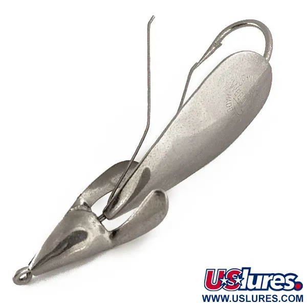 Een vernikkelde laag bedekt het 7 cm (2 3/4") lange lichaam van de Weedless Johnnie O’ Neil Weed Wing 3, met een ontwerp dat dateert uit 1957 uit Akron, Ohio. Met een gewicht van 14 g (1/2 oz) beschikt dit exemplaar (productcode 11596) over de klassieke loden kop met vleugels en het gestanste blad dat in 1962 door Johnnie O’Neil werd gepatenteerd. De enkele, grote omhoogstaande haak wordt beschermd door een lange, veerkrachtige wierbeschermer van metaaldraad, bedoeld voor zware begroeiing. Gepresenteerd in een conditie van 5/5, zijn de metalen oppervlakken uitzonderlijk schoon, met de stempel van de fabrikant duidelijk zichtbaar op het zilverkleurige blad. Dit ontwerp weerspiegelt het tijdperk voordat het kunstaas halverwege de jaren zestig aan Harrison Industries werd verkocht, waarbij het oorspronkelijke Amerikaanse vakmanschap behouden is gebleven. Het lijnoog aan de neus is perfect gevormd en de draadbeschermer behoudt zijn oorspronkelijke spanning tegen de haakpunt.