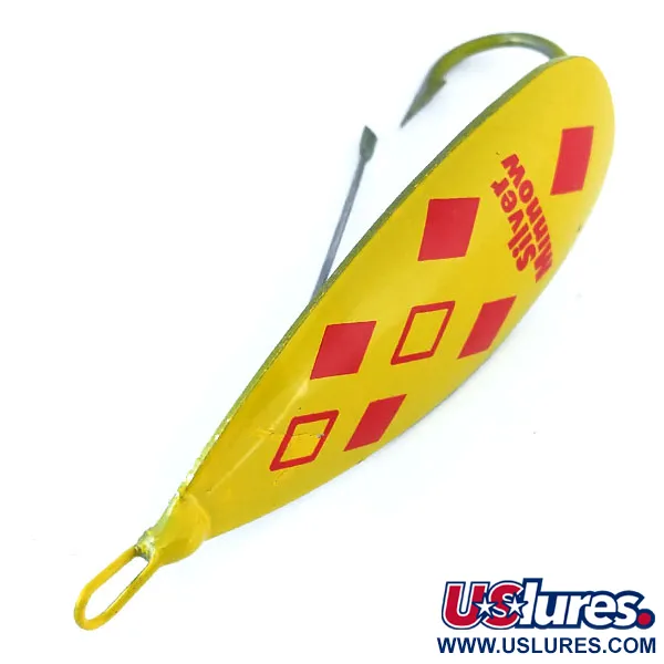 Een levendige gele afwerking met vijf rode ruiten kenmerkt dit exemplaar van de Weedless Johnson Silver Minnow, geregistreerd onder productcode 11066. Met een lengte van 7 cm (2 3/4") en een gewicht van 17 g (3/5 oz) is deze lepel vervaardigd uit een kenmerkende koper- en zinklegering, die in het midden dikker is gemaakt om de juiste haakpositie te behouden. Op de achterkant van de lepel staan de stempels «JOHNSON'S SILVER MINNOW» en «MADE IN U.S.A.», wat duidt op een vintage Amerikaans fabricaat. Het wierloze ontwerp maakt gebruik van een stevige metalen beschermkap voor de vaste enkele haak, waardoor effectief vissen in dichte begroeiing mogelijk is. In de huidige staat, gewaardeerd met een 5/5, blijven de gelakte oppervlakken en de metalen achterzijde helder en strak. Dankzij het technische ontwerp kan de lepel kantelen over een hoek van 270 graden, wat felle flitsen veroorzaakt, terwijl de verzwaarde kern ervoor zorgt dat hij recht loopt zonder extra wartels.