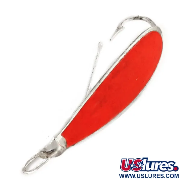 Een opvallende neonoranje afwerking bedekt de voorzijde van deze 6 cm (2 1/4") lepel, wat zorgt voor een contrast met hoge zichtbaarheid tegen de verzilverde body. Deze Weedless Johnson Silver Minnow UV, met productcode 12487, weegt 12 g (2/5 oz) en is een moderne kleurevolutie van het originele ontwerp van Louis Johnson uit 1920. In tegenstelling tot standaard chromen afwerkingen, maakt dit exemplaar gebruik van verzilvering om een helderdere, wittere flits te produceren. De oranje toplaag is specifiek ontworpen voor UV-reactiviteit; bij weinig licht straalt deze een diepe, lumineuze gloed uit, zoals te zien is op de donkere kamer beelden. De lepel is gemaakt van een koper-zinklegering die in het midden aanzienlijk dikker is, een geometrie die helpt de enkele haak rechtop te houden. Deze balans, gecombineerd met de geïntegreerde draadwierbeschermer, maakt het mogelijk om door zware leliebladen of hout te navigeren. Als een vintage USA-gemaakt model weerspiegelt de bouwkwaliteit de originele specificaties voordat de productie naar het buitenland verhuisde. De verzilvering en de UV-reactieve verf vertonen zeer weinig slijtage en de hardware blijft structureel in goede staat, wat dit kunstaas een conditiescore van 4/5 oplevert.