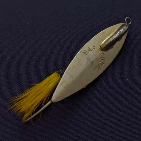 Gestempeld met de naam "MARATHON" op de voorkant, maakt deze vergulde weedless lepel gebruik van een vaste loodkiel die op de achterkant is gesoldeerd voor gewicht en stabiliteit tijdens het binnenvissen. Met een afmeting van 1 3/4" (4,5 cm) en een gewicht van 3/16 oz (6 g), is het ontwerp gecentreerd rond een enkele haak die wordt beschermd door een metalen wierbeschermer om door waterlelies en watervegetatie te navigeren. Een felgele haardressing is bij de haakpunt gebonden, wat een visueel element toevoegt aan de gouden afwerking van het metalen blad. Dit specifieke exemplaar verkeert in 5/5 conditie, met goed bewaarde vergulding en een schone, volle bucktail. Productcode 24597 is voorzien van de karakteristieke gestempelde merknaam die de fabrikant tussen 1929 en 1979 gebruikte.