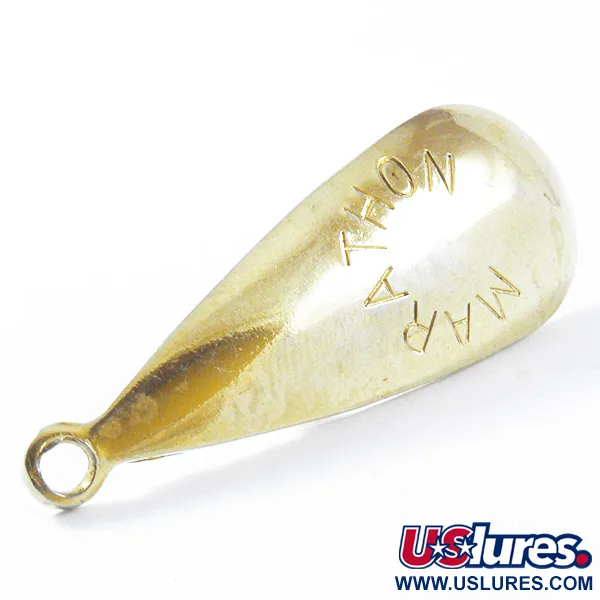 Duidelijk ingestanst op de 7g (1/4oz) druppelvormige body staat de naam "MARATHON", een kenmerk van de Marathon Bait Company uit Wisconsin, die actief was van 1929 tot 1979. Deze Weedless Marathon, herkenbaar aan productcode 3375, heeft een gepolijste gouden afwerking op zijn frame van 4,5 cm (1 3/4"). Om door dichte vegetatie te vissen zonder vast te lopen, bevat het ontwerp een enkele haak die wordt beschermd door een metalen wierbeschermer met een kleine roze kraal. Dit specifieke exemplaar verkeert in uitstekende staat, met behoud van zijn originele glans en zonder tekenen van slijtage, wat een conditiescore van 5/5 rechtvaardigt. De constructie heeft een solide, geïntegreerd lijnoog aan het smalle uiteinde, typerend voor de duurzame hengelsportartikelen die Marathon produceerde tijdens zijn vijftigjarige geschiedenis in het Amerikaanse Midwesten.