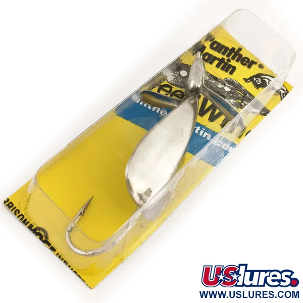 Nikkelafwerkingen zorgen voor een hoogglansprofiel op deze vintage spinner van 1/2 oz (14 g). De Weedless Panther Martin Weed Wing is ontworpen voor zware begroeiing en heeft een kenmerkend druppelvormig blad dat direct door de as is gemonteerd. Dit specifieke exemplaar, gecatalogiseerd onder productcode 11286, bevindt zich in de originele vintage verpakking en is ongebruikt. Met een lengte van 7 cm (2 3/4") is het kunstaas uitgerust met een grote, stevige enkele haak die wordt beschermd door een draadvormige wierbeschermer om vastlopen in dichte vegetatie te voorkomen. De geel-blauwe kaart identificeert het als een product van Harrison-Hoge Industries, voorzien van de iconische Panther Martin-branding en Italiaanse herkomst. De achterzijde van de verpakking bevat een Prop 65-waarschuwing en de contactgegevens van het bedrijf in Port Jefferson, NY. Deze klassieker behoudt zijn glanzende metalen oppervlakken en de integriteit van de originele hardware.