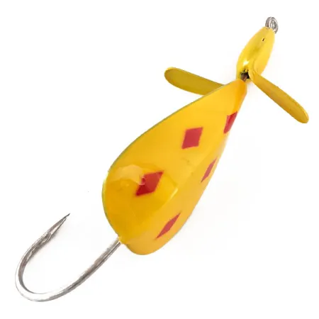 Het „Five of Diamonds“-patroon — een klassieke gele basis met vier duidelijke rode ruiten op het blad en één op de kop — kenmerkt deze Weedless Panther Martin Weed Wing. Ontworpen voor het vissen in dichte vegetatie, is de kunstlure voorzien van een grote enkele haak achter het druppelvormige lichaam. Een geel geverfde metalen propeller op de neus is bedoeld om oppervlaktestoring te creëren zonder vuil te vangen. Dit specifieke item, met productcode 11398, weegt 1/2 oz (14 g) en is 2 3/4" (7 cm) lang. De onderkant van de lepel heeft een blanke, onbeschilderde zilveren metaalafwerking, die contrasteert met de felle lak op de bovenkant. Geproduceerd in de USA, dit exemplaar is ongebruikt en verkeert in uitstekende staat.