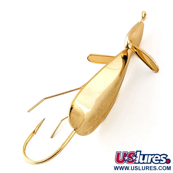 De Weedless Panther Martin Weed Wing weegt 1/2oz (14g) en is voorzien van een speciaal propeller-blad aan de kop. Dit exemplaar, met productcode 12034, heeft een glanzende Gold afwerking over het hele frame van 7 cm (2 3/4") en is in ongebruikte staat. Het Italiaanse vakmanschap is zichtbaar in de montage van de wierbeschermer, die twee fijne draden gebruikt om de omhooggerichte enkele haak te beschermen tegen vastlopers. De constructie bestaat uit een druppelvormige lepel achter een roterende vleugelmontage op een centrale metalen as. Het hooggepolijste gouden oppervlak zorgt voor hoge zichtbaarheid in dichte begroeiing.