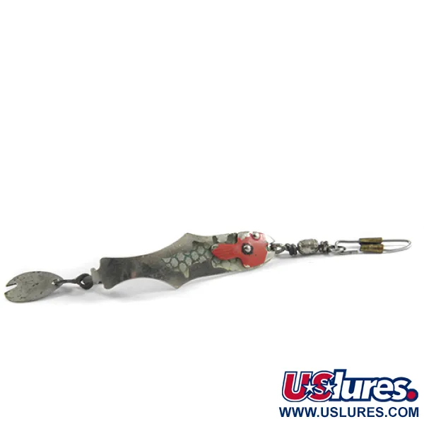 Een nikkelen plating bedekt het lichaam van deze 3 cm (1 1/4") lepel, geaccentueerd door een kenmerkende rood geverfde kop en een subtiel schubbenpatroon dat in het metaal is geëtst. Gecatalogiseerd onder productcode 2435, is de Weedless Pflueger Wobbler voorzien van een functionele draadwierbeschermer die is vastgezet met een prominente schroef aan de onderkant – een handelsmerk van Pfluegers mechanische benadering voor vissen zonder vastlopen. Geproduceerd in de USA, verkeert dit lichte exemplaar van 1,4 g (3/64 oz) in een conditie van 4/5, waarbij het beslag inclusief de voorste wartel en de snapverbinding nog stevig vastzitten. Een klein, bloemblaadjesvormig staartblad is aan de achterzijde bevestigd, wat een extra bewegingspunt toevoegt voor de visser. De stempeling op de achterzijde is opmerkelijk helder gebleven en toont de aanduidingen 'MADE IN USA' en 'PFLUEGER WOBBLER' tegen het gepolijste metalen oppervlak.