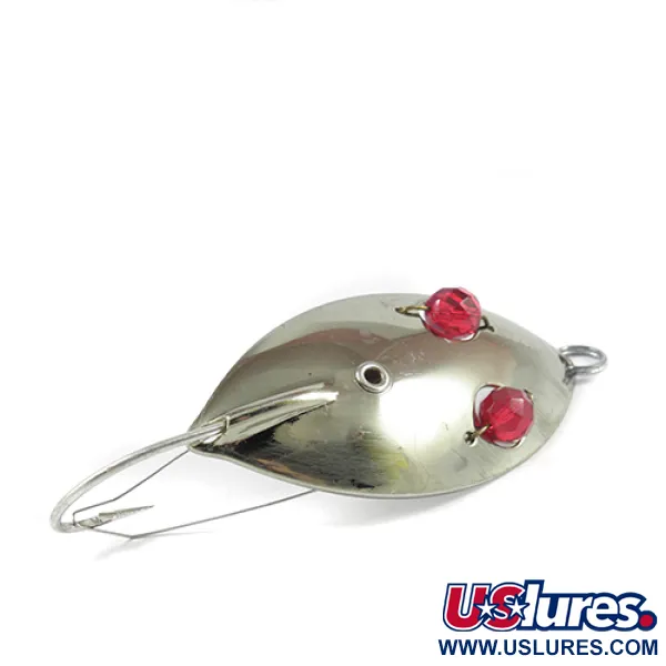 Gefacetteerde rode glazen kralen vormen het onmiskenbare middelpunt van deze klassieke Amerikaans gemaakte lepel, die zelfs bij langzame inhaalmanoeuvres licht vangt. Met een gewicht van 1 oz (25 g) en een lengte van 3" (7,5 cm), is dit exemplaar voorzien van een gepolijste nikkelen afwerking gecombineerd met brons/messing accenten. Deze Weedless Red Eye Wiggler, herkenbaar aan productcode 2327, is een opmerkelijk voorbeeld van het ontwerp dat Eppinger overnam van de oorspronkelijke fabrikant, Hofschneider. De enkele haak wordt beschermd door een dunne draadbeschermer, ontworpen voor het vissen in dichte begroeiing waar snoek zich vaak schuilhoudt. Het metalen oppervlak en de hardware zijn uitzonderlijk schoon, wat resulteert in een conditiescore van 5/5. Aan de concave binnenkant is de ingestempelde naam "Red Eye Wiggler" scherp en duidelijk gedefinieerd tegen het metaal.