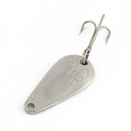 De vernikkelde afwerking zorgt voor een strakke, heldere glans op het gestanste oppervlak van deze Amerikaanse klassieker, wat het historische vakmanschap van Weller onderstreept. Met een lengte van slechts 2,6 cm (1") en een gewicht van 3,5 g (1/8 oz) is de Weller Gypsy King Deluxe (artikelcode 23042) een zeldzame lichtgewicht vondst voor gespecialiseerde vintage collecties. De voorzijde van de lepel is voorzien van een fijn gegraveerd patroon met elegante versieringen rondom een centraal gestileerd embleem, een kenmerkend element van de Deluxe-serie. De achterzijde is glad gepolijst tot een hoogglans nikkelglans. Het kunstaas verkeert in een 5/5 conditie en is ongebruikt, waardoor de originele integriteit bewaard is gebleven van het bevestigingsoog tot de zilverkleurige dreg. Deze onderdelen zijn bevestigd met een stevige splitring, wat kenmerkend is voor de degelijke constructie van Amerikaanse makelij uit het midden van de vorige eeuw.