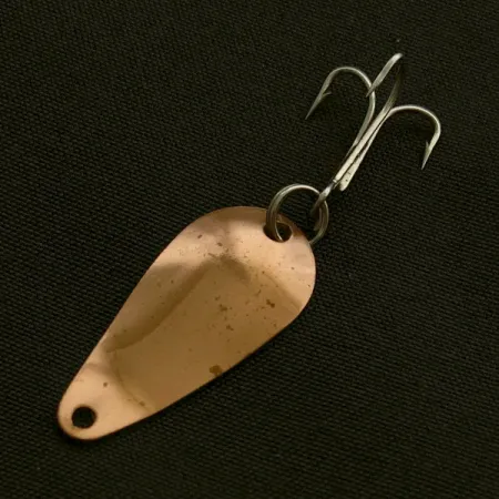 Koperen tinten bepalen de warme uitstraling van deze Weller Gypsy King Deluxe, een klassiek stukje Amerikaanse hengelsportgeschiedenis afkomstig uit de VS. Met een gewicht van slechts 1,5g (3/64oz) en een lengte van exact 2,7 cm (1") is deze micro-lepel een bewijs van de precisie van vroege ultralight kunstaasjes. De gestanste metalen body, herkenbaar aan productcode 23601, heeft een eenvoudige maar effectieve druppelvorm die moeiteloos het licht vangt. Het oppervlak vertoont lichte ouderdomssporen en verkeert in een solide 4/5 staat, wat een zorgvuldige opslag door de jaren heen weerspiegelt. Een stevige zilverkleurige dreg is bevestigd met een betrouwbare splitring, waardoor de hardware robuust blijft. Het bevestigingspunt aan de voorzijde is voorzien van een strak, rond boorgat voor de verbinding met uw onderlijn.