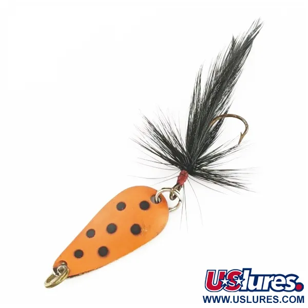 Oranje emaille met opvallende zwarte stippen bedekt het druppelvormige blad van de Weller Gypsy King Deluxe, een klassieke micro-lepel oorspronkelijk uit de VS. Met een gewicht van slechts 1/16oz (1,7g) is dit kunstaas ontworpen voor liefhebbers van lichte uitrusting die vissen op baars of forel. Het lichaam van 2,7 cm (1") is voorzien van een volle zwarte verenhackle die met rood garen aan de haaksteel is gebonden, wat extra volume geeft aan het profiel. Geregistreerd onder productcode 24165, verkeert dit exemplaar in uitstekende staat (5/5), met goed bewaard gebleven onderdelen en een nette afwerking op zowel het blad als de enkele vaste haak. Wellers benadering van de Gypsy King-serie combineerde vaak metallic afwerkingen met felle kleuren, een ontwerpkeuze die duidelijk zichtbaar is in het contrast tussen het oranje oppervlak en de donkere verenhackle.