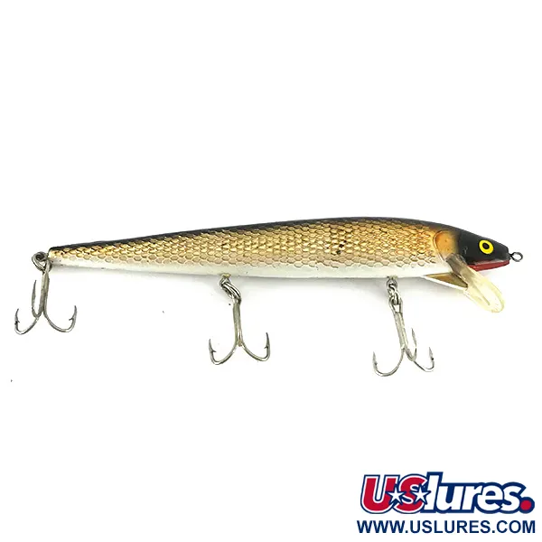 Gouden schubpatronen sieren het 14 cm (5 1/2") lange frame van deze vintage Whopper Stopper Hellcat, die geregistreerd staat onder productcode 7744. Met een gewicht van 10 g (1/3 oz) heeft deze plug een donkere kop die strak overgaat in het reflecterende gouden lichaam, geaccentueerd door gele ogen met een rode rand. Dit in de VS gefabriceerde model maakt gebruik van een configuratie met drie haken, typisch voor langere minnows bedoeld voor werpen of trollen. De heldere duiklip is direct in de neus van het kunstaas bevestigd onder het bevestigingsoog. Dit exemplaar verkeert in 5/5 conditie, waarbij de lak en de hardware uitstekend bewaard zijn gebleven.