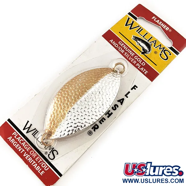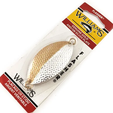 Echt 24-karaats goud- en zilverbeslag bedekt het gehamerde oppervlak van deze in Canada gemaakte lepel, wat zorgt voor een tweekleurige flits die is ontworpen voor hoge zichtbaarheid in verschillende wateromstandigheden. Met een lengte van 7 cm (2 3/4") en een gewicht van 9 g (1/3 oz), beschikt de Williams Flasher F1 over een centrale stabiliserende rug die helpt om een gestage beweging te behouden tijdens het langzaam binnenvissen. Dit exemplaar draagt productcode 11670 en is ongebruikt, nog in de originele vintage verpakking uit Sherbrooke, Quebec. De fabrikant adviseert om deze te monteren als attractor gevolgd door een onderlijn van 30,5 cm tot 61 cm (12" tot 24") naar een kleiner kunstaas, een opstelling die vaak wordt gebruikt bij het vissen op meerforel of snoek. Elk technisch element, inclusief de edelmetaalafwerking en de gestempelde merknaam, benadrukt de kwaliteit die geassocieerd wordt met het merk Williams.