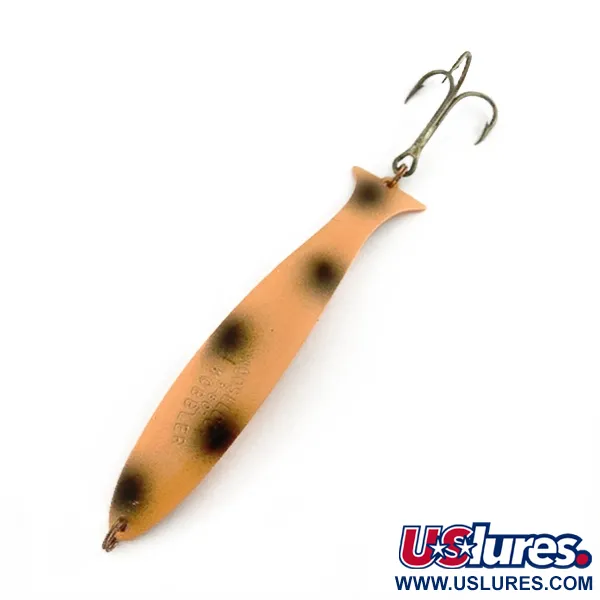 Deze lepel heeft een lengte van 9,5 cm (3 3/4"), waarbij de iconische "MOOSELOOK WOBBLER" stempel direct in het metalen lichaam is geslagen. Met een gewicht van 11 gram (2/5 oz) is de afwerking voorzien van een zachte zalmkleurige basis, geaccentueerd door vijf duidelijke donkere stippen op de flank. Geproduceerd door Williams in Canada, weerspiegelt het ontwerp de jarenlange traditie van het merk in het vervaardigen van slanke, visvormige kunstazen die zijn afgestemd op noordelijke vissoorten. Het beslag is nog steeds glanzend en stevig, voorzien van een enkele grote dreg die aan de smalle staartsectie is bevestigd. Dit exemplaar verkeert in een conditie van 5/5, met een schoon oppervlak en scherpe markeringen, wat het een topstuk maakt voor elke verzamelaar van vintage Canadees hengelsportmateriaal. Herkenbaar aan productcode 23593, is de kenmerkende "vissenstaart"-vorm aan de achterzijde een waar handelsmerk van het silhouet van dit specifieke model.