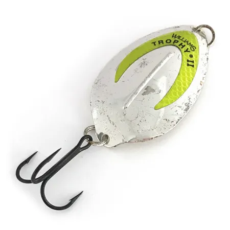 Echte verzilvering geeft een unieke reflecterende kwaliteit aan deze 21g (3/4oz) lepel, een afwerking die de Canadese fabrikant koos vanwege de superieure schittering in diep of troebel water. Met een lengte van 6,5cm (2 1/2") is de Williams Trophy (Productcode 8277) voorzien van een kenmerkend U-vormig chartreuse accent dat dient als een opvallend aanbetenpunt. Onder omstandigheden met weinig licht reageert dit geverfde inzetstuk met een duidelijke gloed, wat de natuurlijke glans van het verzilverde lichaam aanvult. Het oppervlak vertoont lichte gebruikssporen en behoudt een conditiescore van 4/5, wat de geschiedenis weerspiegelt terwijl de lepel volledig functioneel blijft. Een zware splitring borgt een zwarte dreg, ontworpen voor het zware werk bij het werpen of trollen op grotere roofvissen zoals meerforel en snoek. Dit exemplaar vertegenwoordigt de klassieke ontwerpnormen ontwikkeld door de gebroeders Williams, die begin 1900 pionierden in het gebruik van edelmetaalplating bij de fabricage van hengelsportartikelen.