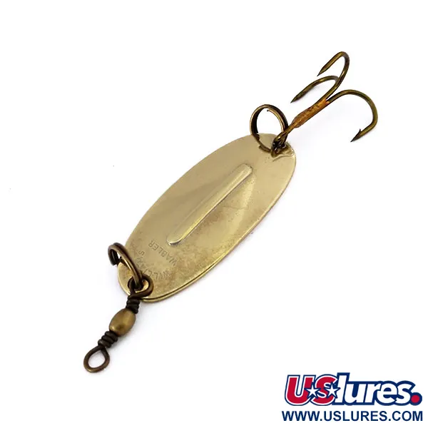 In het midden van deze klassieke lepel is een stabiliserende lengterib geperst, een kenmerkend ontwerpelement dat bedoeld is om de stabiliteit te behouden tijdens zowel snelle als langzame inhaalslagen. Deze Williams Wabler, herkenbaar aan productcode 10619, heeft een glanzende gouden afwerking die karakteristiek is voor de hoogwaardige beplating van het merk. Met een afmeting van 1 1/2" (4 cm) en een gewicht van 1/4 oz (7 g) is het een compact kunstaas dat geschikt is voor het vissen op snoek of snoekbaars. Dit exemplaar verkeert in 5/5 conditie, met een zeer schoon oppervlak waarop de stempels "Made in Canada" en "Williams Wabler" scherp zijn gebleven. Hoewel het ontwerp in 1914 in Buffalo ontstond, vertegenwoordigt dit specifieke kunstaas het erfgoed van de Canadese productiefaciliteit waar de gehele productie in 1978 werd gecentraliseerd. Het is voorzien van originele hardware, inclusief een scherpe dreg en een messing afgewerkte wartel, beide bevestigd met robuuste splitringen.