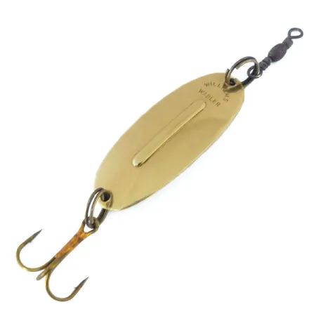 Gestempeld met de markering 'MADE IN CANADA', toont het messingkleurige lichaam van deze 4 cm (1 1/2") lepel de precisie die dit model al sinds het begin van de 20e eeuw in de tackleboxen houdt. Dit specifieke exemplaar draagt productcode 10999 en heeft een veelzijdig gewicht van 7 g (1/4oz). De kenmerkende verhoogde langsribbel in het midden van het goudkleurige blad is een functioneel kenmerk, ontworpen om stabiliteit te behouden bij zowel werpen als trollen op snoek en snoekbaars. De productie verhuisde in 1978 exclusief naar Canada, wat overeenkomt met de duidelijke belettering op de holle zijde. De conditie is een solide 5/5 en het is een zeer goed onderhouden voorbeeld van de Canadese hengelsportgeschiedenis. Een tonwartel is bevestigd aan de bovenste splitring, terwijl een gebronsde dreg de hardware aan de achterzijde compleet maakt.