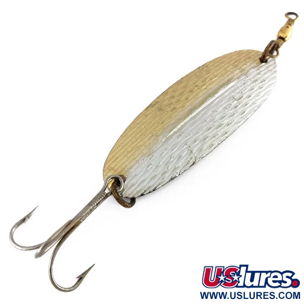 Een kenmerkende lengteribbel loopt door het midden van deze 21 g (3/4 oz) lepel, een typisch ontwerpkenmerk van de Williams Wabler W60 (productcode 9849) dat helpt een stabiele koers te behouden bij verschillende inhaalsnelheden. De tweekleurige Silver / Gold afwerking is aangebracht via een echt edelmetaal-platingproces, een kenmerk van de Canadese productie van Williams dat zorgt voor een uitzonderlijke schittering bij het vissen op snoek of snoekbaars. Met een lengte van 8,2 cm (3 1/4") heeft de body een gehamerde textuur bestaande uit talloze kleine deukjes die ontworpen zijn om licht door de waterkolom te verspreiden. De hardware omvat een stevige koperen wartel aan het oog en een scherpe dreg aan het uiteinde, beide met sporen van zorgvuldig eerder gebruik. Met een conditiescore van 4/5 is de edelmetaalcoating goed bewaard gebleven, met slechts minimale oppervlakteslijtage door de tijd in een tackledoos. Dit specifieke ontwerp is ontwikkeld om in balans te blijven, waarbij de stabiliserende rib als kiel fungeert tijdens het binnenhalen.