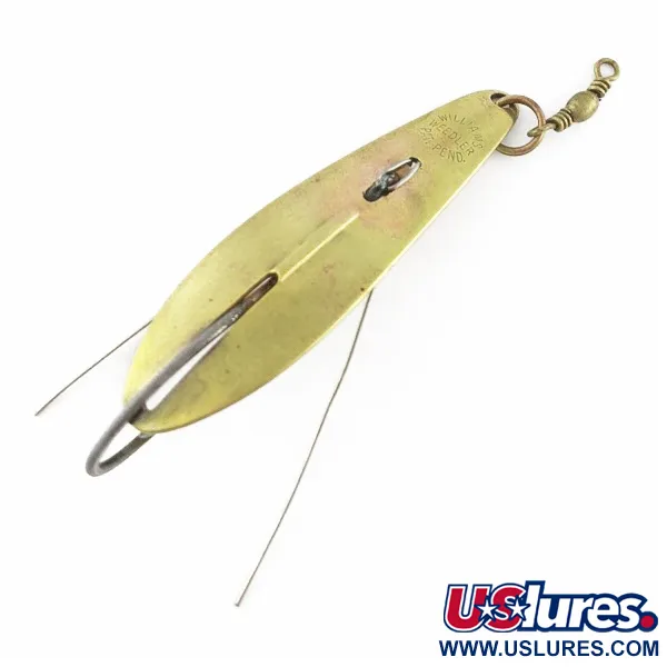 Met de herkomst "MADE IN CANADA" direct in het messing gestempeld, is de Williams Weedler een klassieke oplossing voor het vissen in dichte vegetatie. Deze lepel van 17 g (3/5 oz) maakt gebruik van een vaste enkele haak die wordt beschermd door twee slanke metalen wierbeschermers die helpen vastlopers in zware begroeiing te voorkomen. De massieve messingkleur blijft helder op het langwerpige lichaam, dat is voorzien van het kenmerkende reliëflogo en de productnaam. De montage omvat een robuuste messing splitring aan de voorzijde, verbonden met een vintage tonwartel voor de lijnbevestiging. Met een staat van 4/5 heeft het metalen oppervlak een schone en eerlijke uitstraling, vrij van noemenswaardige slijtage. Artikelcode 24080 identificeert deze specifieke werplepel, die is vervaardigd met de precisie die kenmerkend is voor het metaalwerk van de Canadese fabrikant.