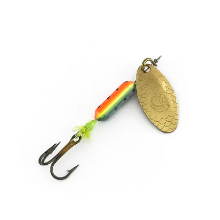 Een gouden wilgenblad-blad met gestempelde schubbentextuur kenmerkt deze 1/8oz (3,6g) Yakima Bait spinner. Het 2 1/4" (5,5cm) lange lichaam is uitgevoerd in een Fire Tiger kleurenschema, met een oranje rug, een limoengroene buik en zwarte stippen op de flanken. Het blad, voorzien van een gewichtsopdruk en het Rooster Tail-logo, is gemonteerd op een rechte metalen as die typerend is voor de mid-century ontwerpen van Howard Worden. De staart bestaat uit handgebonden chartreuse hackle-veren die de scherpe bronzen dreg camoufleren. Deze spinner, geregistreerd onder code 7976, vertegenwoordigt het Yakima Bait erfgoed in uitstekende staat. De in-line configuratie is perfect uitgebalanceerd voor precisieworpen in druk bevist forelwater waar het subtiele profiel van een spinner vaak de doorslag geeft.