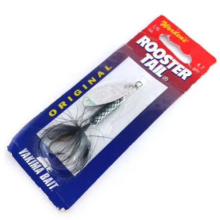 Vernikkelde wilgenblad-bladen gecombineerd met een dichte zwarte hackle van veren kenmerken deze specifieke creatie van Yakima Bait. Met een gewicht van 4,7 g (3/16 oz) en een lengte van 7 cm (2 3/4") vormt dit model 9836 een hoeksteen van de Worden’s Original Rooster Tail erfenis. Het ontwerp, ontwikkeld door Howard Worden in Wisconsin, ontleent zijn effectiviteit op druk beviste forellenbeken aan de combinatie van het slanke profiel en de natuurlijke beweging van de staartvezels. Dit exemplaar zit in de originele verpakking en is ongebruikt. Wie het zilveren blad van dichtbij bekijkt, ziet het iconische merklogo duidelijk ingestanst, wat past bij de klassieke inline spinnerconstructie die al sinds de jaren vijftig een vast onderdeel is van Amerikaanse tackleboxen. De achterkant van de witte kaart bevat de standaard Yakima Bait-identificatie en herkomst, wat de status als een goed bewaard exemplaar voor verzamelaars bevestigt.