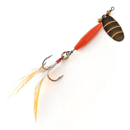 Met een gewicht van 1/3oz (9g) is deze in Amerika gemaakte Worth #301 een klassieke spinner die specifiek is ontworpen voor het vissen in stromend water. Met een lengte van 9 cm (3 1/2") is de constructie voorzien van een opvallend rood spoelvormig lichaam dat het nodige gewicht biedt voor nauwkeurige worpen. Het blad is afgewerkt in een contrastrijk patroon van zwart met drie horizontale gouden strepen, gecombineerd met messing kralen en een ruiter die de rotatie om de centrale as vergemakkelijkt. Voor de haakversiering heeft de fabrikant een mix van gele en witte veren gebruikt, vastgezet met een rode draadwikkeling op de dreg. Dit exemplaar, gecatalogiseerd onder product code 16533, verkeert in een 5/5 conditie, waarbij zowel het materiaal als de versiering zeer goed bewaard zijn gebleven. Kleine messing afstandhouders zijn tussen het lichaam en het bevestigingsoog geplaatst om de juiste afstand tussen de componenten tijdens gebruik te waarborgen.