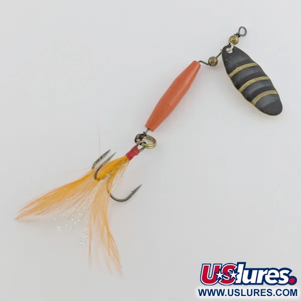 Een levendig oranjerood sigaarvormig lichaam verankert deze klassieke inline spinner, een weerspiegeling van de uitmuntende productie van de in Stevens Point, Wisconsin gevestigde Worth Company. Omdat Worth legendarisch is voor het leveren van hoogwaardige componenten zoals splitringen en wartels aan de gehele hengelsportindustrie, toont een afgewerkt kunstaas zoals deze #301, geïdentificeerd door productcode 24436, hun precisie-hardware in een compleet pakket. Het druppelvormige blad heeft een opvallende zwarte voorkant met gouden geschulpte strepen, terwijl de achterkant een gehamerde goudtextuur onthult. Dit exemplaar, beoordeeld met een conditie van 5/5, bevat een dreg versierd met oranje en gele veren, vastgehouden door een strakke rode draadwikkeling. De constructie maakt gebruik van kleine koperen kralen en een gespecialiseerde beugel om een soepele rotatie te vergemakkelijken tijdens het gestaag binnenvissen in zoetwateromgevingen voor forel of baars. Het is een solide voorbeeld van mid-century Amerikaans vakmanschap uit het hart van de Midwest.