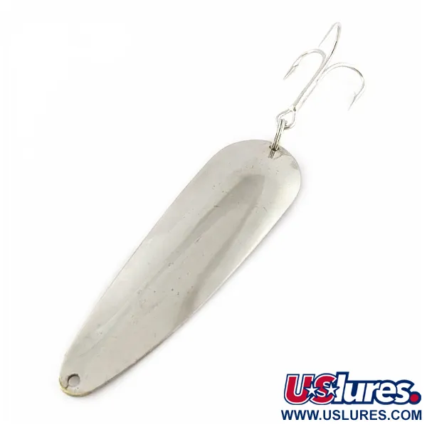 De gepolijste nikkelen afwerking reflecteert het licht over het 9 cm lange lichaam van deze in Amerika gemaakte lepel. Met een gewicht van 21 g is deze Worth Chippewa een klassiek voorbeeld van het duurzame metaalwerk van de Worth Company uit Wisconsin. Het druppelvormige profiel is gestanst met strakke randen en voorzien van een sterke dreg die met een heavy-duty splitring aan de achterzijde is bevestigd. Aan de voorzijde biedt een nauwkeurig geboord gat het bevestigingspunt voor de lijn of onderlijn. Dit exemplaar, met productcode 24315, verkeert in uitstekende staat met een conditie van 4/5 en een helder, reflecterend oppervlak. Het eenvoudige, effectieve ontwerp van de Chippewa weerspiegelt een mid-century benadering voor het werpend vissen en trollen op grotere zoetwatervis, waarbij zichtbaarheid en gewicht de belangrijkste overwegingen waren.